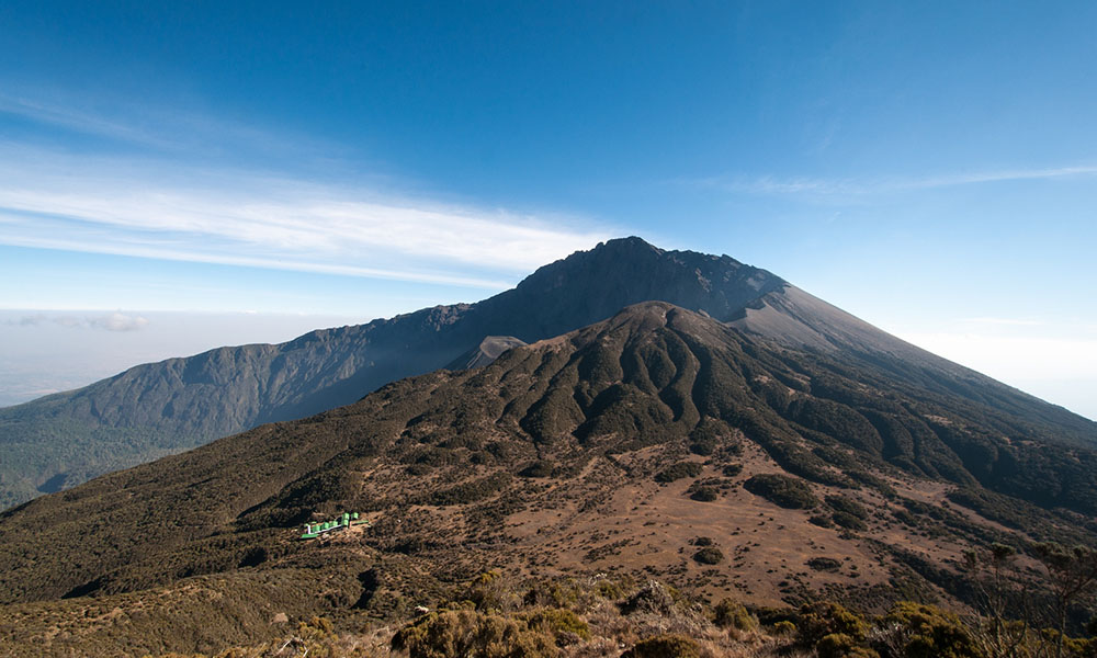 Mount Meru, which is located within the Arusha National Park, overlooking Arusha town, is the second highest mountain in Tanzania after Kilimanjaro. It is an exciting mountain to climb. There are numerous animals to see on the lower slopes and vegetation zones change as you ascend. Parts of the climb along the saddle are very steep but the views of Kilimanjaro 80km to the northeast and of the cliff face from the summit down to Meru Crater are spectacular. One does not however need technical equipment for the climb.